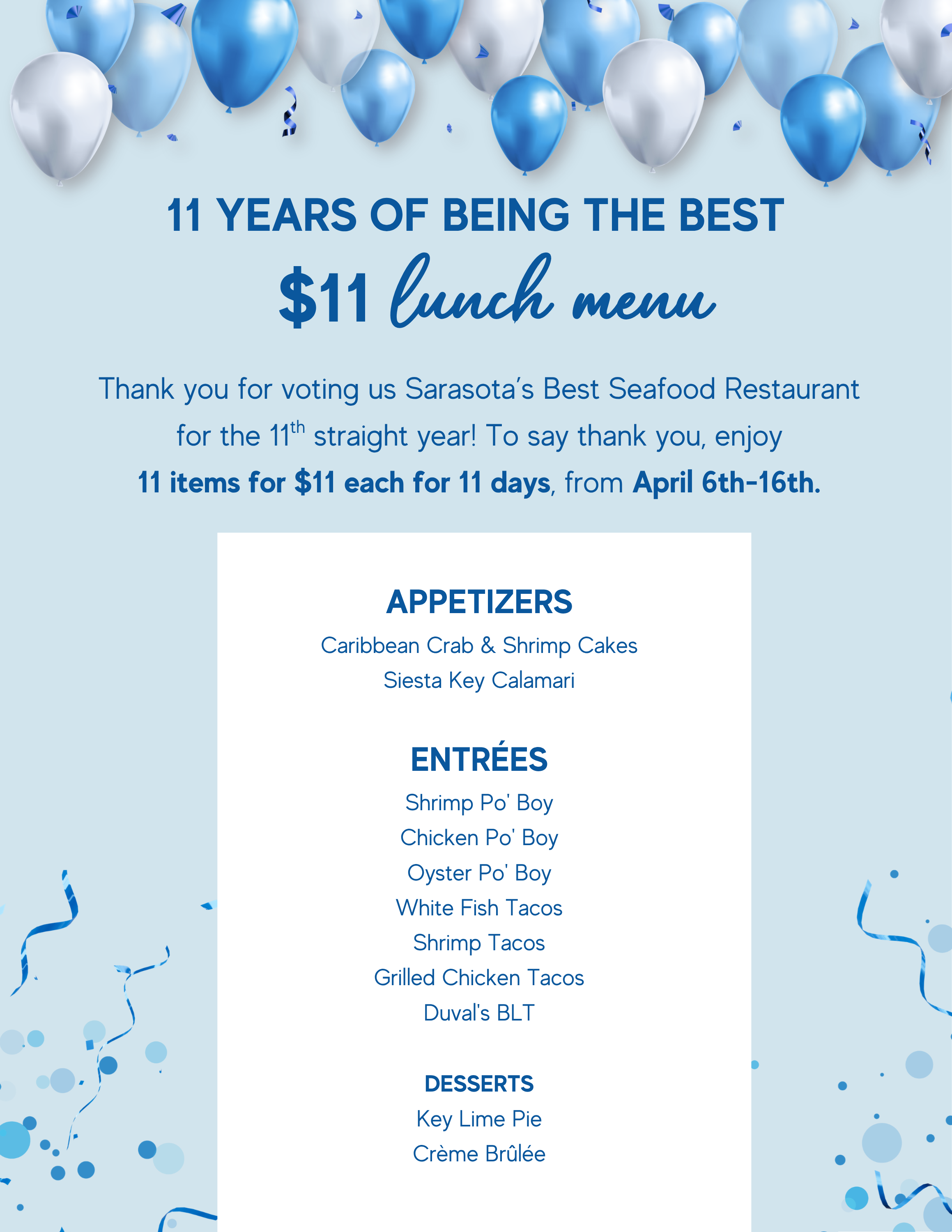 Thank you for voting us Sarasota’s Best Seafood Restaurant 11 years in a row!
