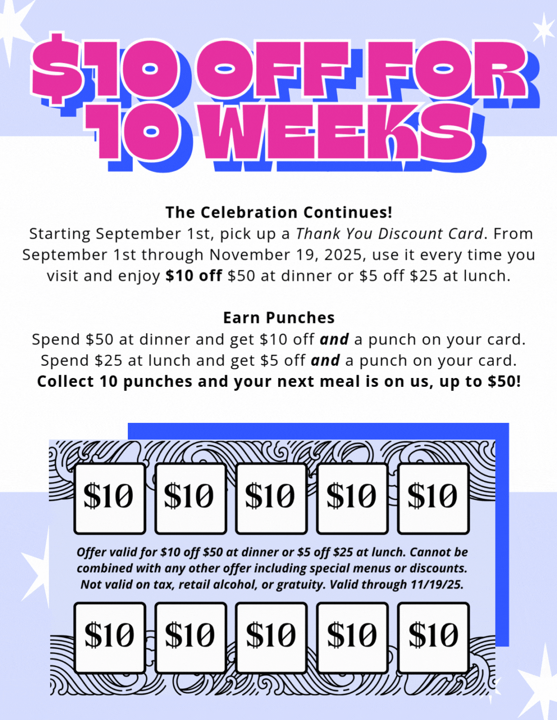 Starting Sept. 1st, pick up a Thank You Discount Card at the end of your dining experience. On subsequent visits through November 19, 2025, use it every time you dine & enjoy $10 off $50 at dinner or $5 off $25 at lunch.