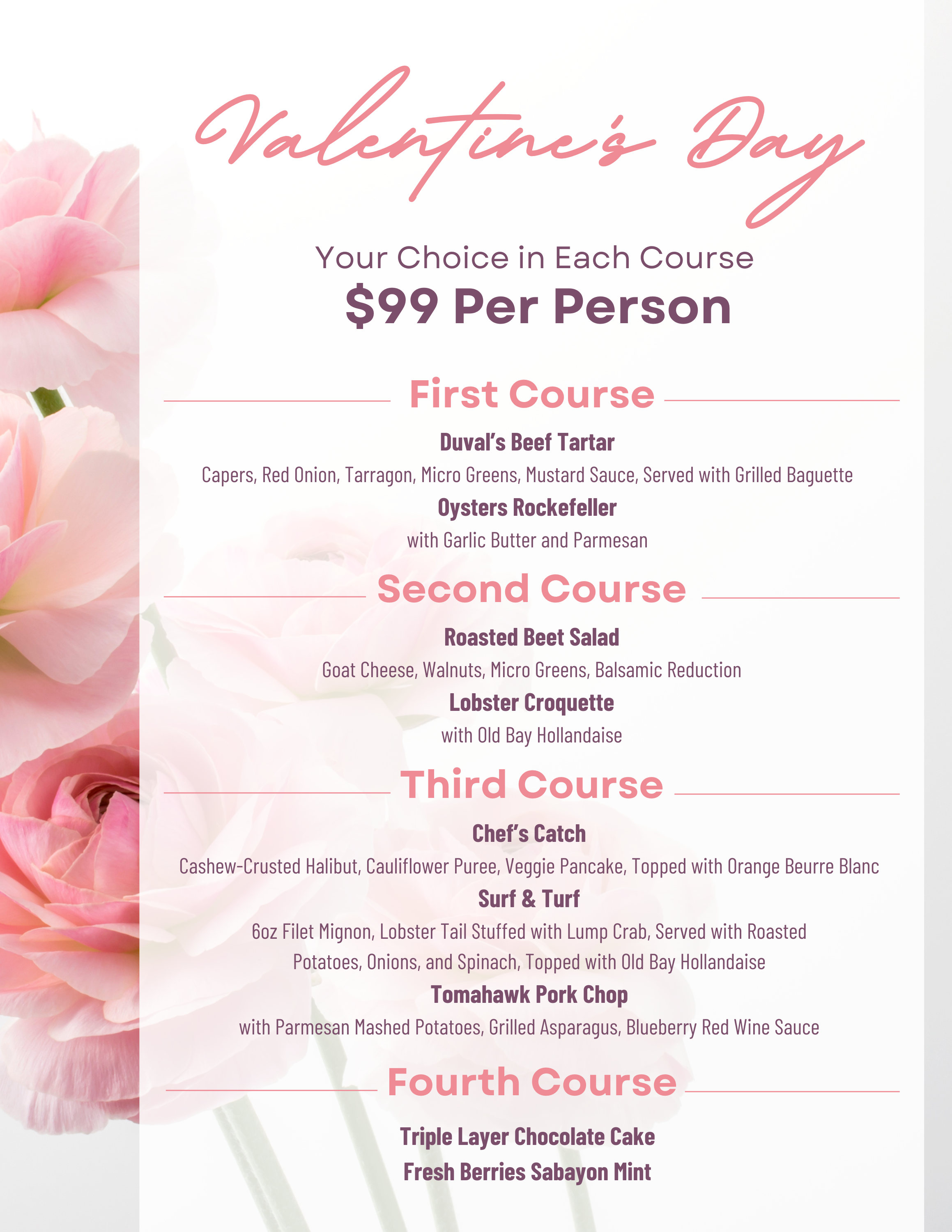 The Valentine’s Day menu will only be available 2/14 and is the exclusive menu